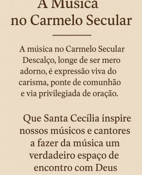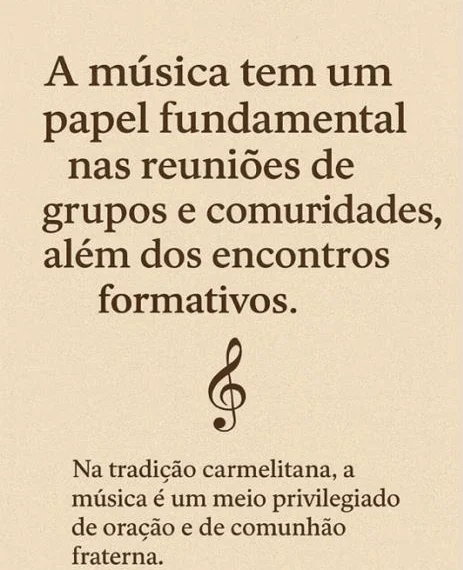 A música, no Carmelo Secular, não é um detalhe secundário. Ela participa da espiritualidade, da formação, da fraternidade e da missão. É uma via de oração, uma linguagem universal que eleva o coração e une a comunidade.
